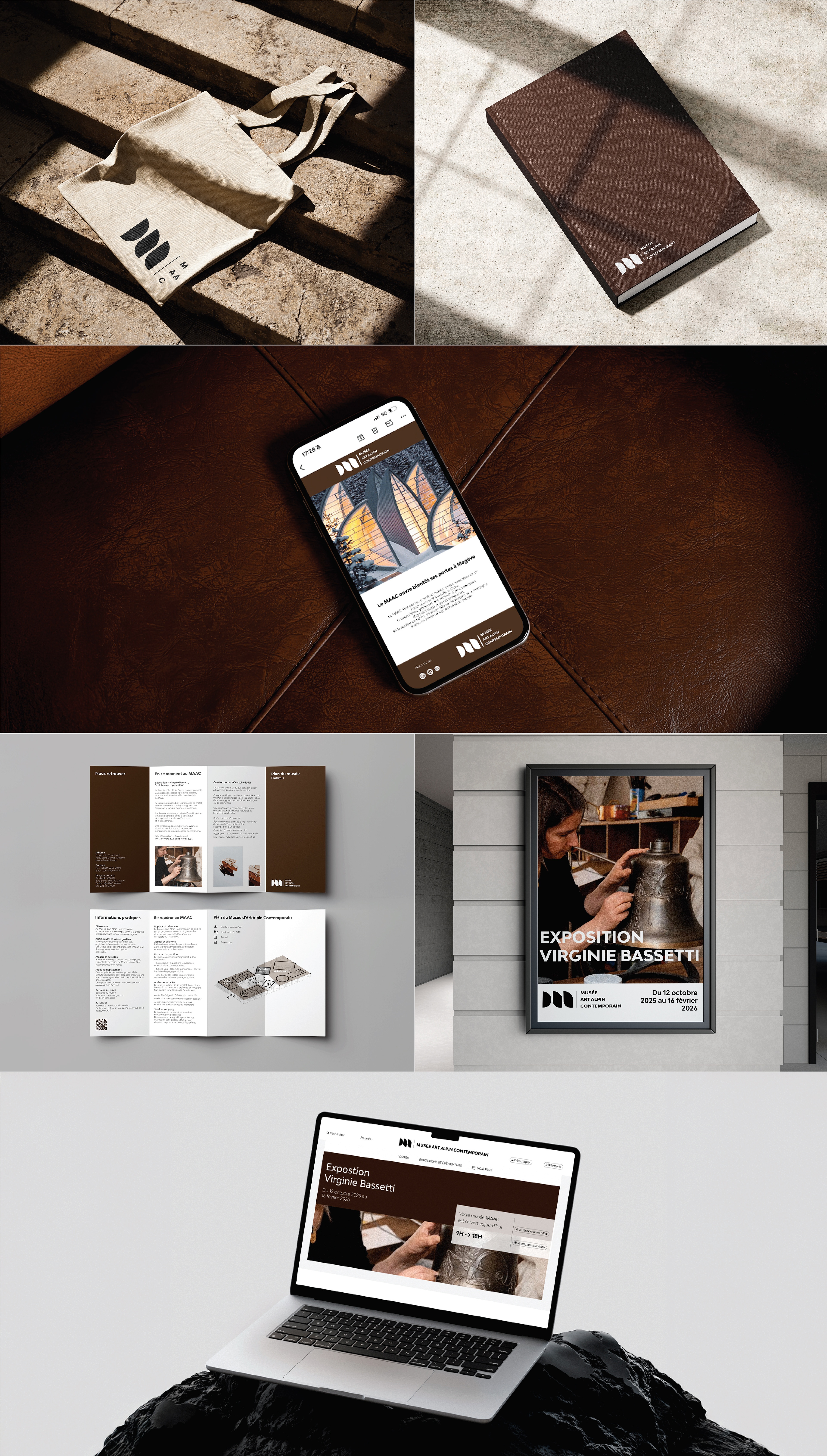 Elle définit les règles et les éléments visuels qui assurent la cohérence de l’identité du MAAC. Elle explore les codes de l’artisanat alpin et de l’architecture contemporaine à travers la typographie, la palette de couleurs, les formes et les compositions graphiques. Réalisée en travail de groupe, cette charte a servi de base commune pour décliner une identité visuelle forte, durable et reconnaissable sur l’ensemble